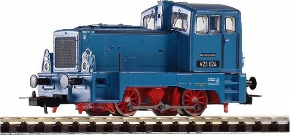 Vorbildgereues und detailliertes Modell der Rangierdiesellokomotive V23 in den Farben und mit der Beschriftung der DR. Trotz ihrer Kompaktheit verfügt sie dank separat angesetzter Teile über viele Details. Farbgebung und Bedruckung, einschließlich aller Zier- und Beschriftungselemente, sind von höchster Qualität und entsprechen der Expert-Produktlinie. Das Modell ist mit einem leistungsstarken Motor mit Schwungmasse ausgerüstet, die Kraftübertragung erfolgt per Kuppelstange auf die zweite Achse. Die Fahreigenschaften kommen besonders im Langsamfahrbetrieb zur Geltung. Dank des robusten Druckguss-Zinkrahmens können realistisch lange Züge gezogen und rangiert werden. Weiß/rote LED-Beleuchtung wechselt fahrtrichtungsabhängig. Das Modell kann mit einem speziell vorgesehenen Digitaldecoder mit Soundmodul und Lautsprecher nachgerüstet werden. Hauptmerkmale: zwei Achsen Motor mit Schwungmasse zwei bereifte Antriebsräder Lichtwechsel weiß/rot fahrtrichtungsabhängig PluX22-Schnittstelle gemäß NEM 658 Kupplungsaufnahme nach NEM 362 mit Kurzkupplungskinematik Dokumentation: Betriebsanleitung und Ersatzteilliste Modell Nr. 52542 (DE, EN, F, ITA, S, CHN, NL, POL, RUS, CZ)