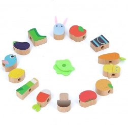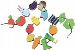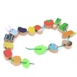 Das Spielzeug ist aus hochwertigem Holz gefertigt und mit gesundheitlich unbedenklichen Farben bemalt. Die Textilschnur mit Sicherheitsverschlüssen sorgt für einfaches und sicheres Auffädeln, sodass Kinder allein oder gemeinsam mit den Eltern spielen können. Das Auffädelspiel unterstützt die Entwicklung von Feinmotorik, logischem Denken und visueller Wahrnehmung.