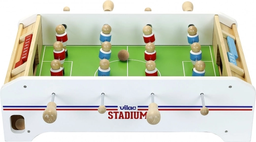 Entdecken Sie den hochwertigen Holz-Tischfußball VILAC Stadium, der traditionelles Spielzeughandwerk mit moderner Verarbeitung verbindet. Kinder trainieren Koordination, Reaktion und Strategie, während sie bei spannenden Partien viel Spaß haben. Metallstangen mit sanftem Lauf und Holzgriffe sorgen für eine komfortable Steuerung der Spieler in roten und blauen Trikots.