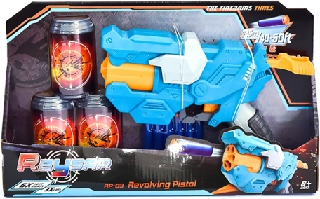 • Komplettes Set: Pistole, 3 Zielscheiben (Plastikdosen) und 6 Schaumstoffprojektile