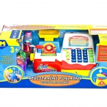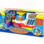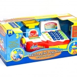 Beliebte Spielkasse mit ausziehbarer Geldschublade, funktionierenden Tasten, Mikrofon, Waage, Körbchen und einer Reihe von Lebensmittelattrappen für kleine Kaufleute. Batteriebetrieben. Geeignet für Kinder ab 3 Jahren.