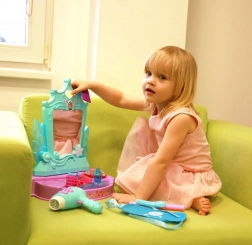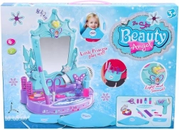 Dieses stylische Schminktisch-Set in türkis‑violetter Farbkombination bringt Kindern stundenlangen kreativen Spielspaß. Das Highlight ist der Spiegel mit Licht- und Soundeffekten – nach der Aktivierung erklingen Melodien, die die Atmosphäre beim Friseur- oder Kosmetiksalon-Spiel verstärken.