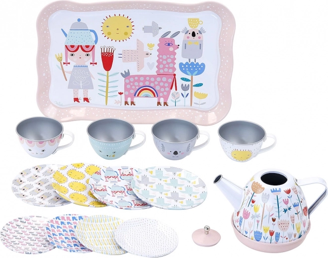 Tassen, Untertassen, Dessertteller, Tablett und Kanne sind aus Metall – leicht, aber stabil für den täglichen Spielspaß.