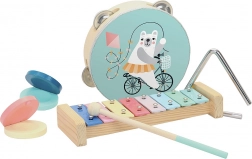 Das Set enthält alles Nötige für ein kleines Heimatorchester: ein farbiges Xylophon mit Schlägel, ein Tamburin mit Bär, eine klar klingende Triangel und ein Paar handliche Kastagnetten. Dank ergonomischer Gestaltung liegen die Instrumente gut in kleinen Händen und motivieren Kinder zum musikalischen Spiel.