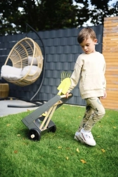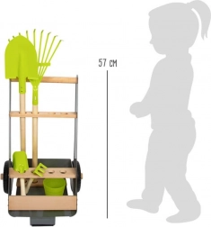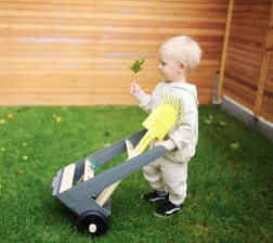 Dank der festen Räder und stabilen Konstruktion lässt sich der Wagen leicht durch den Garten ziehen und schieben, was das Gärtnern für Kinder erleichtert.