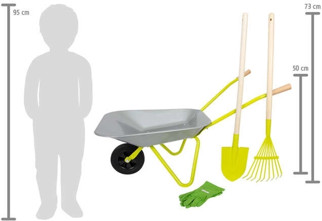• Praktische Maße: Schubkarre ca. 79 × 36 × 50 cm, Griffhöhe 50 cm; Länge von Schaufel und Harke ca. 73 cm.
