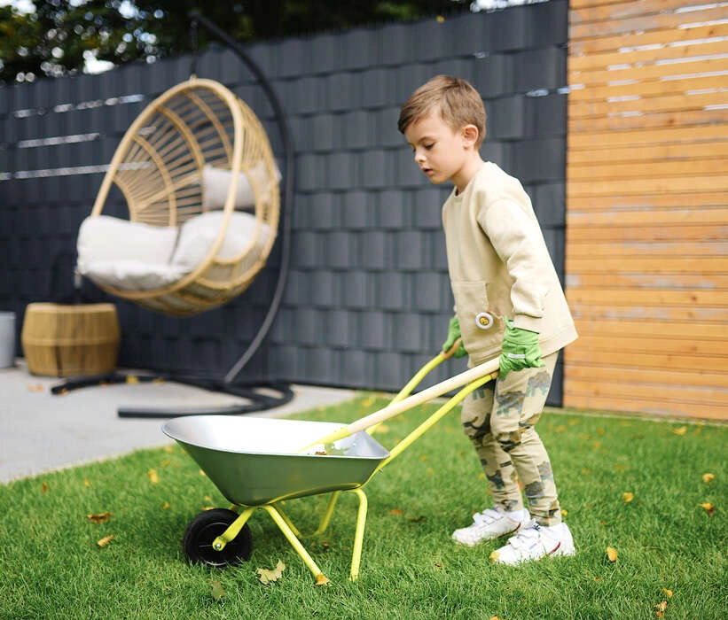 Die Metallmulde, der stabile Rahmen und das Einrad-Design erleichtern das Manövrieren. Kinder transportieren Blätter, Erde und kleines Werkzeug mühelos dank eines Volumens von ca. 10 Litern und einer Traglast bis 15 kg.