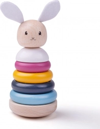 Dieser hochwertige Holz-Steckturm in Pastellfarben ist ein ideales erstes Lernspielzeug. Kinder stapeln die Ringe vom größten zum kleinsten, stärken die Hand-Auge-Koordination und lernen Farben und Formen zu unterscheiden. Textile Ohren und ein Schwänzchen des Häschens verleihen dem Spiel einen taktile[n] Reiz.