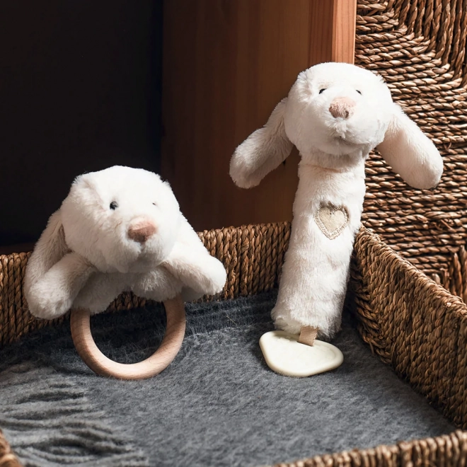 Sanftes Rasseln stimuliert das Gehör, die Quietsche motiviert zum Drücken und der Beißring sorgt für Linderung – alles in einem bezaubernden Spielzeug.