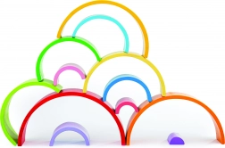 12 farbige Bögen bieten unendliche Kombinationsmöglichkeiten – von Brücken und Tunneln bis hin zu abstrakten Bauwerken. Fördert die Fantasie und das selbstständige Spiel.