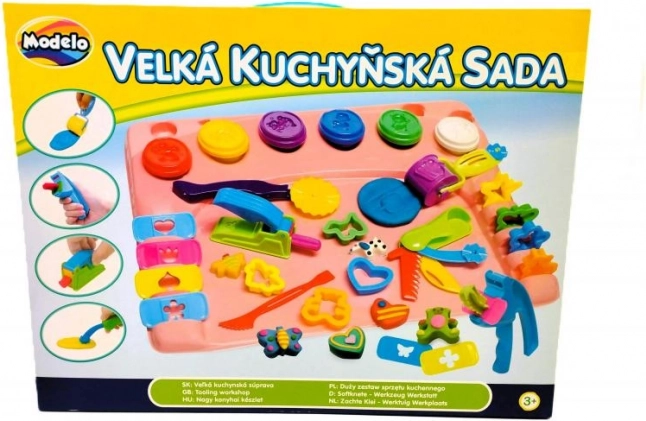 Modelo großes Küchenset mit Unterlage: 31 Zubehörteile und 6 Becher Knetmasse zum Gestalten, Dekorieren und zur Förderung der Feinmotorik. Tolles Geschenk für Kinder.