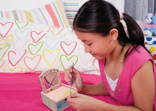 Entdecken Sie die Freude am Gestalten mit diesem wunderbaren Kosmetikschächtelchen. Dieses Set ermöglicht es Ihnen, Ihr eigenes Schächtelchen für kleine Schätze zu bemalen und zu dekorieren – ideal für kreative Kinder.