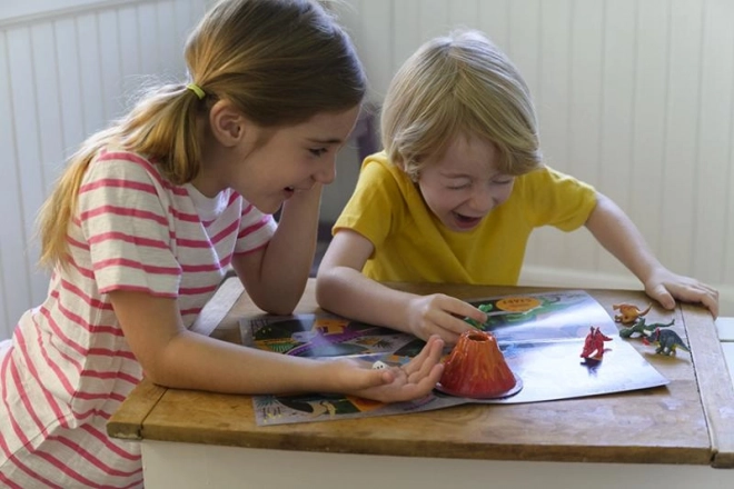 Male 6 Dinosaurier und einen Vulkan und du kannst ein Abenteuerspiel spielen und einen Vulkanausbruch durchführen.