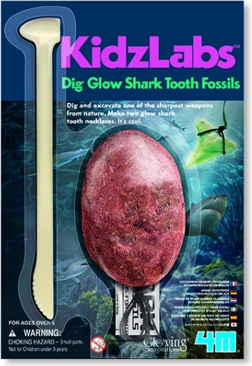 Enthält 2 im Dunkeln leuchtende Haizähne, eingebettet in einen Gipsblock, ein Spezialwerkzeug, eine Schnur und eine Anleitung.