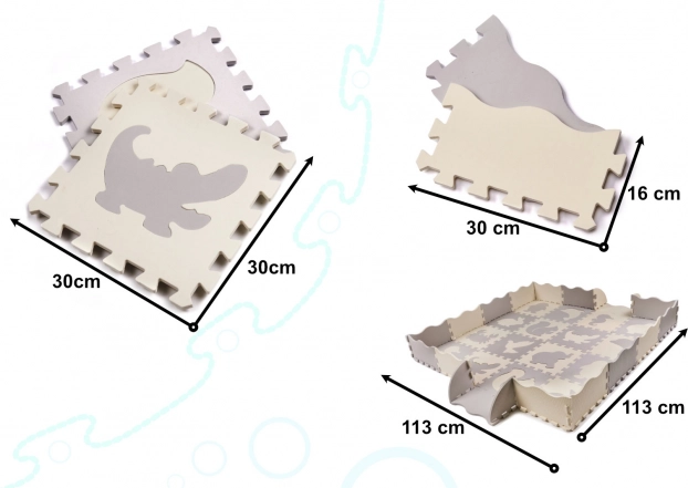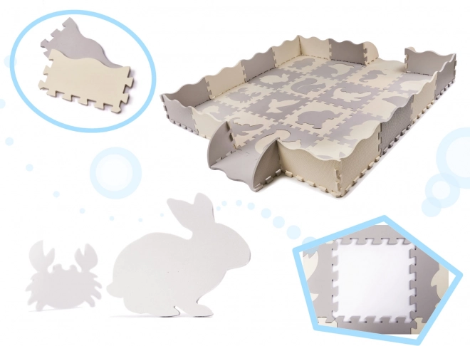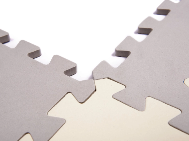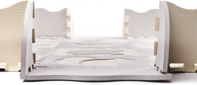 Weiche Kinder-Spielmatte aus Schaumstoff-Puzzleteilen mit herausnehmbaren Formen schafft einen sicheren und kreativen Spielbereich. Dank der erhöhten Ränder lässt sich ein Laufstall bauen, der Spielzeug innen hält. Die Matte ist wasserfest, hat eine rutschfeste Oberfläche und dämpft Stöße hervorragend – ideal für die ersten Schritte. Die neutralen Farben Grau und Ecru passen in jedes Interieur.