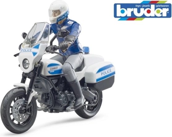 Das Polizeimotorrad DUCATI Scrambler von Bruder ist ein detailgetreues Modell für kleine und große Fans der Rettungsdienste. Das Motorrad hat drehbare Lenkung für einfaches Manövrieren und einen klappbaren Ständer für sicheren Stand. Die Polizistenfigur besitzt bewegliche Gliedmaßen, sodass sie in Fahrposition gesetzt oder neben dem Fahrzeug aufgestellt werden kann.