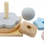 Klassisches Spielzeug mit fünf stapelbaren Formen und einer Holzkugel, die ideal für kleine Kinderhände ist. Durch ihre Form ist sie leicht zu greifen und hilft, die Koordination und die feinmotorischen Fähigkeiten der Hände zu entwickeln.