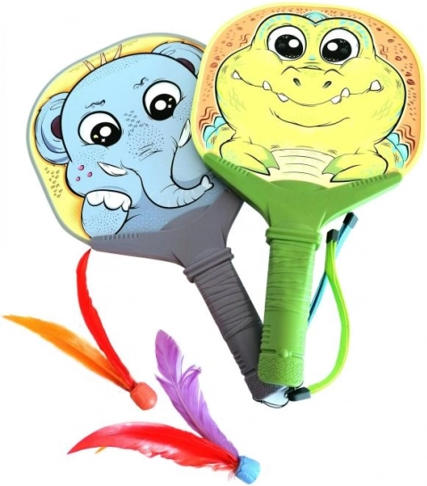 Schläger mit Federbällen im Tiermotiv.