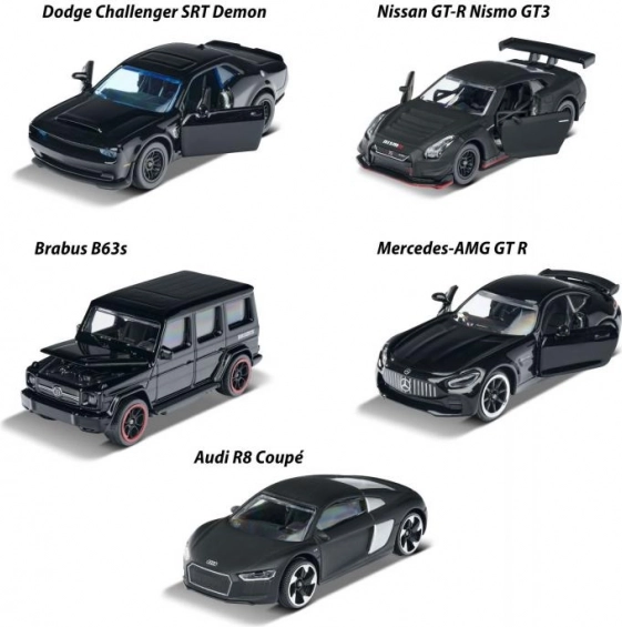 Im Set enthalten sind AUDI R8, BRABUS B63, NISSAN GT3 NISMO GTR, DODGE DEMON und Mercedes-AMG GTR – eine Auswahl, die jeden Auto-Fan begeistert.