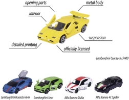 In der Verpackung finden Sie eine Auswahl legendärer Fahrzeuge: ALFA ROMEO 4C Spider, LAMBORGHINI Countach LP 400, LAMBORGHINI Huracán Avio, LAMBORGHINI Urus und ALFA ROMEO Giulia. Dank gelenkiger Teile und funktionierender Federung ist die Fahrt geschmeidig und realistisch. Perfekt für Kinder ab 3 Jahren und als stilvolle Ergänzung für jede Sammlung.