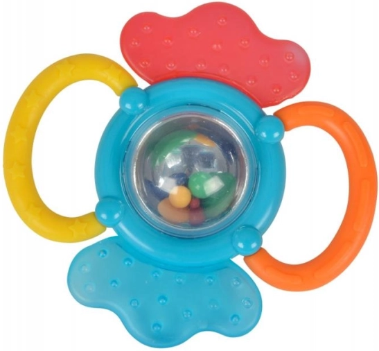 Kombination aus Rassel und Beißring in einem, ideal für Kinder ab 3 Monaten. Bietet Unterhaltung und fördert die sensorische Entwicklung des Kindes.