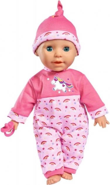 Die Puppe ist in einem rosa Outfit mit Einhornmotiv gekleidet, was sie zu einem reizvollen Spielobjekt für Kinder macht.
