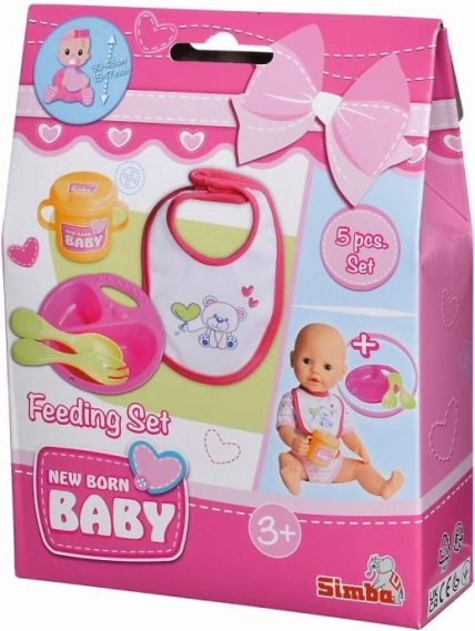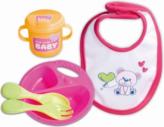 Teller, Löffel, Gabel, Becher mit Henkeln und ein Stofflätzchen – alles in einem Paket für realitätsnahes Füttern der Puppe.