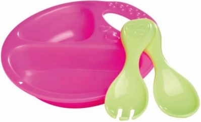 Leichtes Geschirr aus Kunststoff mit abgerundeten Formen und ergonomischem Besteck unterstützt selbstständiges Spiel und die Feinmotorik.
