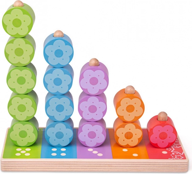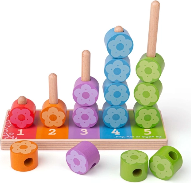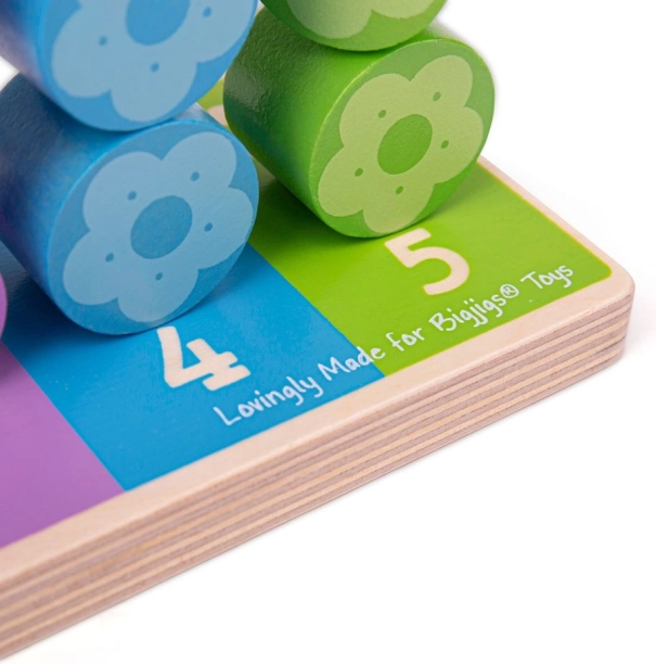 Jede Säule hat ihre Zahl und Farbe, sodass Kinder das Prinzip von Zuordnung und Anzahl leicht verstehen. Die Blümchenteile liegen auch in kleinen Händen gut und motivieren sowohl zum selbstständigen Spiel als auch zum gemeinsamen Entdecken mit den Eltern.