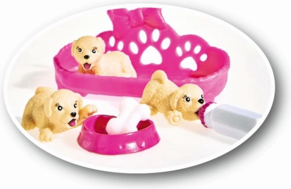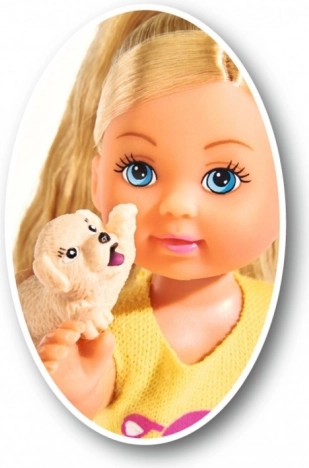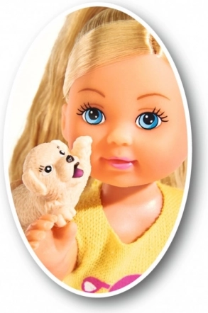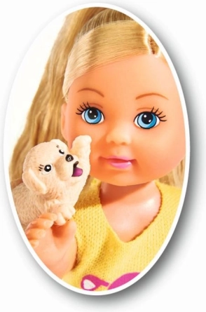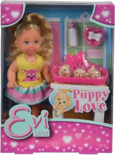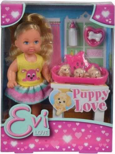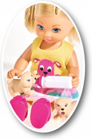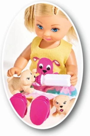 Entdecken Sie die entzückende Evi Puppe mit ihren niedlichen Welpen. Diese charmante Puppe trägt ein hübsches Kleidchen und kommt mit einem Korb voller Welpen, die für stundenlangen Spielspaß sorgen.