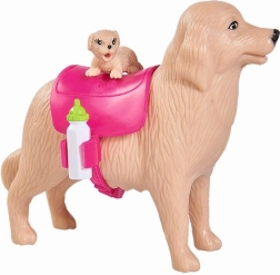 Die rosa Trage auf dem Hund bietet Platz für die Welpen und ein Fläschchen – das bringt neue Spielideen und interaktive Elemente ins Spiel.