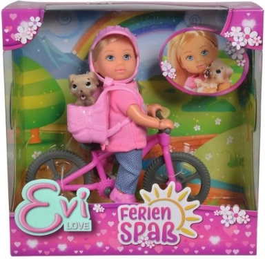 Die niedliche Puppe Evi ist bereit für einen Fahrradausflug – mit Fahrradhelm, stylischem Fahrrad und einem treuen Hündchen im Rucksack. Ideal für Kinder ab 3 Jahren und fördert Fantasie und bewegungsreiche Geschichten.