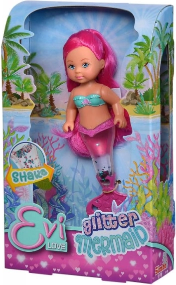 Die niedliche Puppe Evi Love als Meerjungfrau verzaubert Kinder mit einer glitzernden Flosse, in der sich nach dem Schütteln schimmernde Glitzerpartikel wirbeln. Ideal für fantasievolles Spielen und zum Sammeln. Die Puppenhöhe beträgt 14 cm. Wir versenden eine zufällige Auswahl aus 3 Varianten, der Preis gilt für 1 Stück.