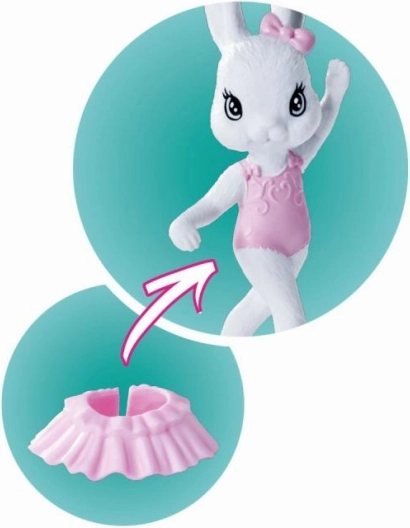 Dank beweglicher Gelenke an Ellbogen und Handgelenken lässt sich die Puppe leicht in klassische Ballettpositionen bringen. Enthalten ist auch ein kleines Häschen – Ballerina, das Spiel-Szenarien erweitert und die Fantasie fördert.