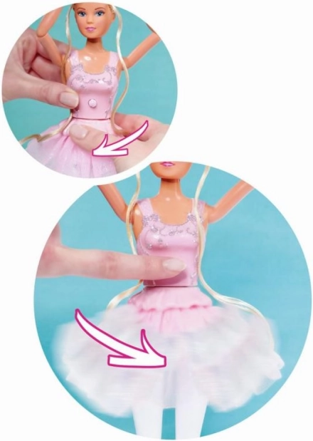 Die Puppe Steffi Love – tanzende Ballerina bringt ein elegantes Ballett-Erlebnis ins Kinderzimmer. Ein stylisches Top mit glitzernden Akzenten und ein rosa Tutu sorgen für einen bezaubernden Look, während der rosenförmige Knopf die Rotation des Rocks für den Effekt einer echten Aufführung auslöst.