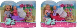 Evi mit Baby im tiefen Kinderwagen bietet Spaß für kleine Pflegerinnen. Praktische Zubehörteile sind im Set enthalten.