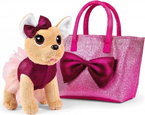 Plüschhündchen Chihuahua mit Schleife in einem rosafarbenen glitzernden Outfit und Tasche mit Schleife. Größe 20 cm.