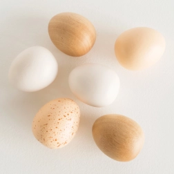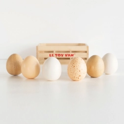Sechs Holzeier in einer stabilen Kiste mit Griffen sorgen für ein authentisches Koch- und Einkaufserlebnis. Die ideale Erweiterung für die Kinderküche und den Marktstand.