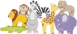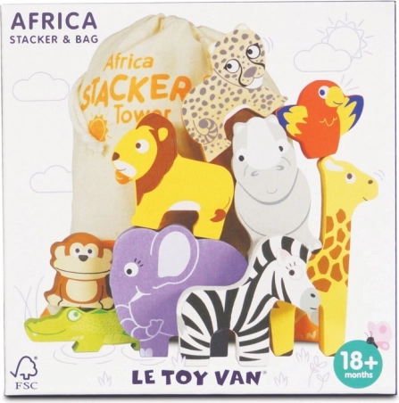 Dieses verspielte Set bringt ein Stück Wildnis ins Kinderzimmer. Kinder können aus den Tieren – Giraffe, Löwe, Elefant, Zebra, Affe, Nashorn, Gepard, Krokodil und Papagei – einen möglichst hohen Turm bauen und dabei Gleichgewicht, Geduld und Vorstellungskraft trainieren. Balancespiele fördern logisches Denken und unterstützen die Wahrnehmung von Formen und Farben.