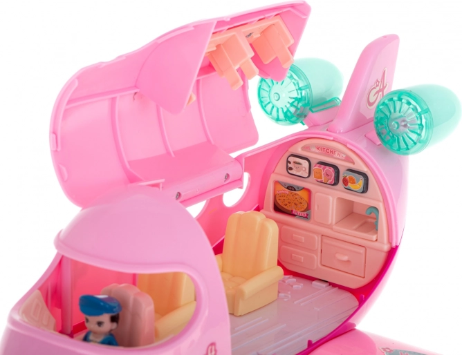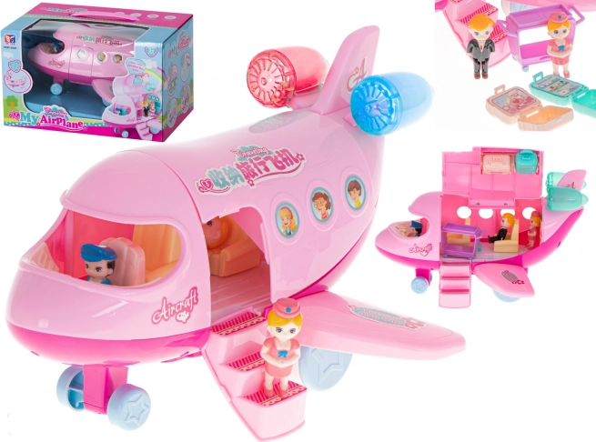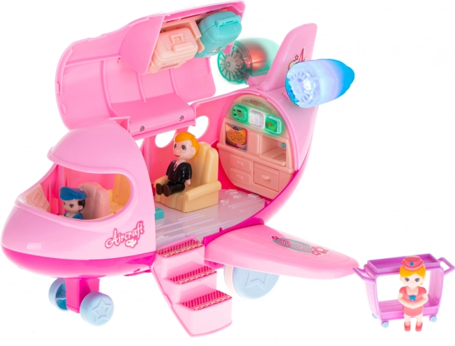 Beim Drücken der Knöpfe gibt es Geräusche bekannt von einem echten Flughafen ab, einschließlich der Landung. Es leuchtet mit bunten LED-Lichtern. Das Flugzeug spielt außerdem Melodien. Das Flugzeug ist mit beweglichen Rädern ausgestattet. Im Flugzeug wartet auf die Passagiere der Pilot. Er nimmt an Bord einen eleganten Reisenden und eine Flugbegleiterin. Während des Fluges ist neben der atemberaubenden Aussicht aus dem Fenster für Erfrischungen gesorgt, die auf einem speziellen Wagen serviert werden. Ohne Gepäck können Sie natürlich nicht reisen, daher enthält das Set zwei öffnende Koffer mit abnehmbaren Griffen.