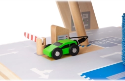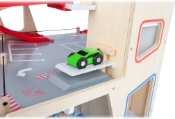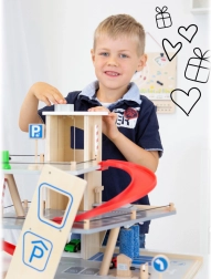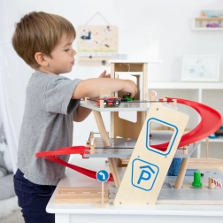 Entdecken Sie ein robustes Holzparkhaus mit drei Etagen, funktionierendem Aufzug und sanften Rampen für endlosen Spielspaß mit Autos. Inklusive zwei Autos, Tankstelle, Ladestation für Elektroautos, Hebebühne, realistischer Autowaschanlage mit Bürsten sowie mechanischen Schranken auf jeder Ebene. Gummierte Schutzkanten sorgen für eine sichere Fahrt, und detaillierte Markierungen fördern das Verkehrsverständnis.