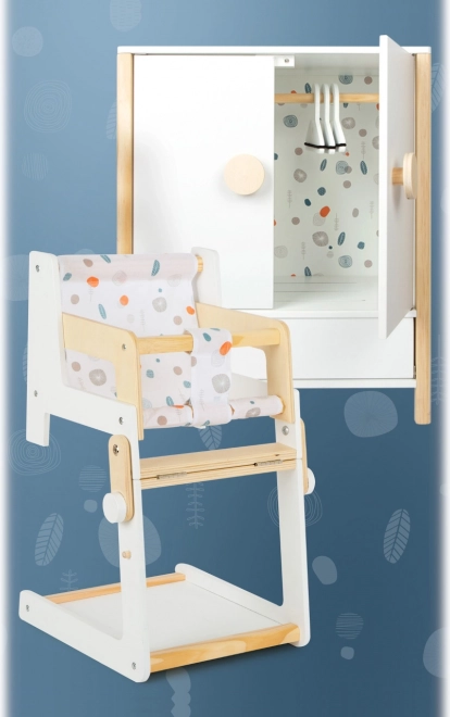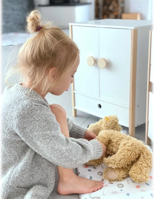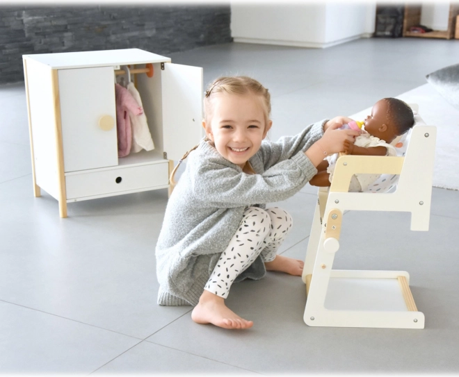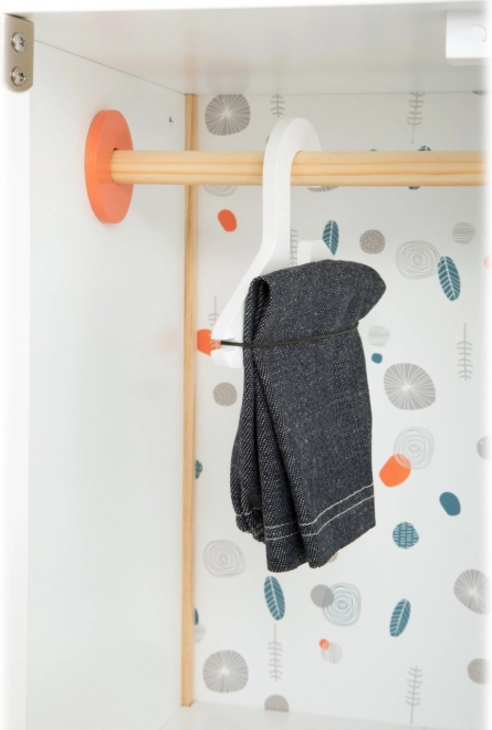 Langlebige Holzkonstruktion, stabile Verarbeitung und sichere, abgerundete Kanten sorgen für bequemes und sicheres Spielen. Der Schrank fördert Selbstständigkeit, Ordnungssinn und regt die Fantasie beim Pflegespiel mit Puppen an.