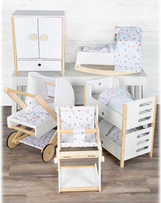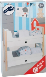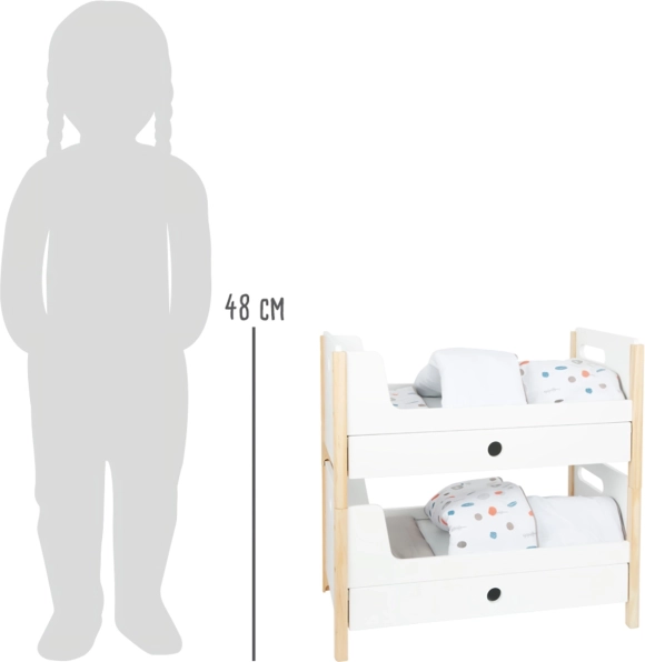 Stilvolles hölzernes Etagenbett für Puppen und Kuscheltiere bis 46 cm aus der Reihe Little Button begeistert mit klarem skandinavischem Design, stabiler Konstruktion und abgerundeten Kanten. Es kann als zwei separate Einzelbetten oder als Etagenbett mit Leiter verwendet werden; inklusive genderneutraler Bettwäsche und praktischer Schubladen für Zubehör.
