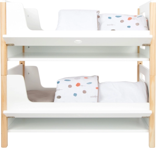 Im Lieferumfang enthalten sind Bettwäsche in neutralen Farben und oversized Decken, die Puppen oder Kuscheltiere bis 46 cm bequem beherbergen. Schubladen unter jedem Bett bieten cleveren Stauraum für Kleidung und kleine Accessoires. Das ideale Accessoire fürs Kinderzimmer oder die stilvolle Puppenecke der Little Button-Kollektion.