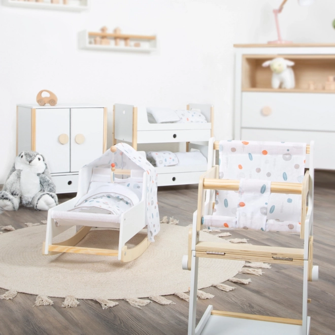 Stilvolle Puppenwiege im nordischen Stil für Kinder ab 3 Jahren. Sie bietet eine stabile Holzkonstruktion, Schaukelleisten, einen leicht abnehmbaren Baldachin und beidseitige, genderneutrale Bettwäsche. Unter der großen Decke schlafen Puppen und Stofftiere bis 46 cm bequem. Elegante Pastelltöne und abgerundete Kanten passen perfekt ins moderne Kinderzimmer.