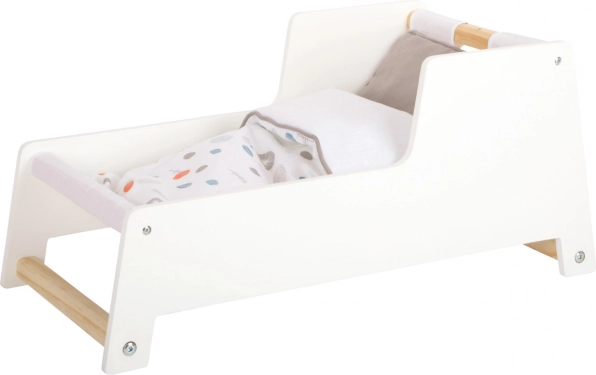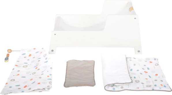 Im Lieferumfang enthalten sind beidseitige, neutral gehaltene Bettwäsche und eine große Decke, unter der Puppen oder Stofftiere bis 46 cm bequem Platz finden. Sanfte Farben und minimalistische Linien machen sie zu einem geschmackvollen Accessoire für jedes Interieur und fördern kreatives und nachahmendes Spiel.