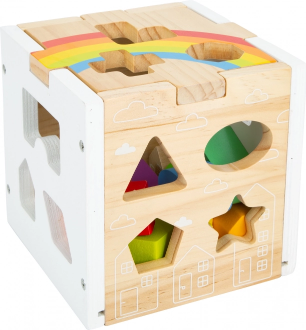Dieser moderne Holz-Steckwürfel SMALL FOOT besticht durch die klare Optik von naturbelassenem Holz in Kombination mit weißen Paneelen und farbenfrohen Elementen. Kinder stecken Formen wie Kreis, Stern, Dreieck, Kreuz, Wölkchen oder Häuschen in die passenden Öffnungen und trainieren spielerisch Feinmotorik und logisches Denken.