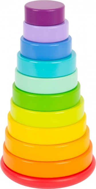 Mit zehn bunt gefärbten Scheiben und einer Stange mit abgerundetem Sockel fördert dieser Turm die Entwicklung motorischer Fähigkeiten und die Unterscheidung von Farben.
