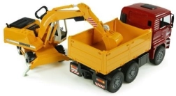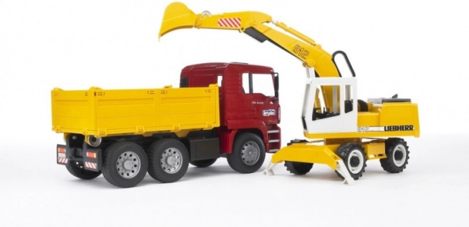 Großartiges Bruder-Set für kleine Bauherren! Enthält einen roten MAN-Lkw mit hochwertiger Kippmulde und einen gelben Liebherr-Bagger mit drehbarer Kabine und voll funktionsfähigem Baggerarm. Ideales Spielzeug für stundenlangen Spaß.