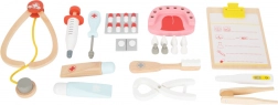 Dieser Kinder-Arztkoffer bietet viele Spiel- und Lernmöglichkeiten. Er enthält Holzwerkzeuge wie Spritze, Zahnbürste, Bohrer, Zange und ein Zahnmodell. Kinder können zu kleinen Zahnärzten werden und die Grundlagen der dentalen Hygiene spielerisch erlernen.